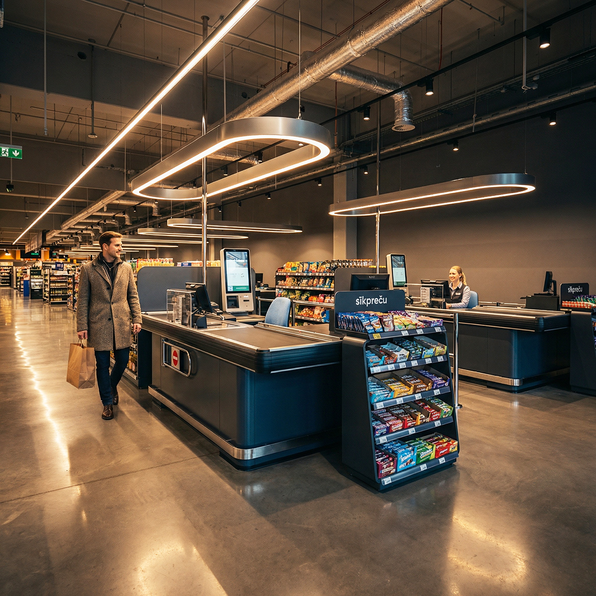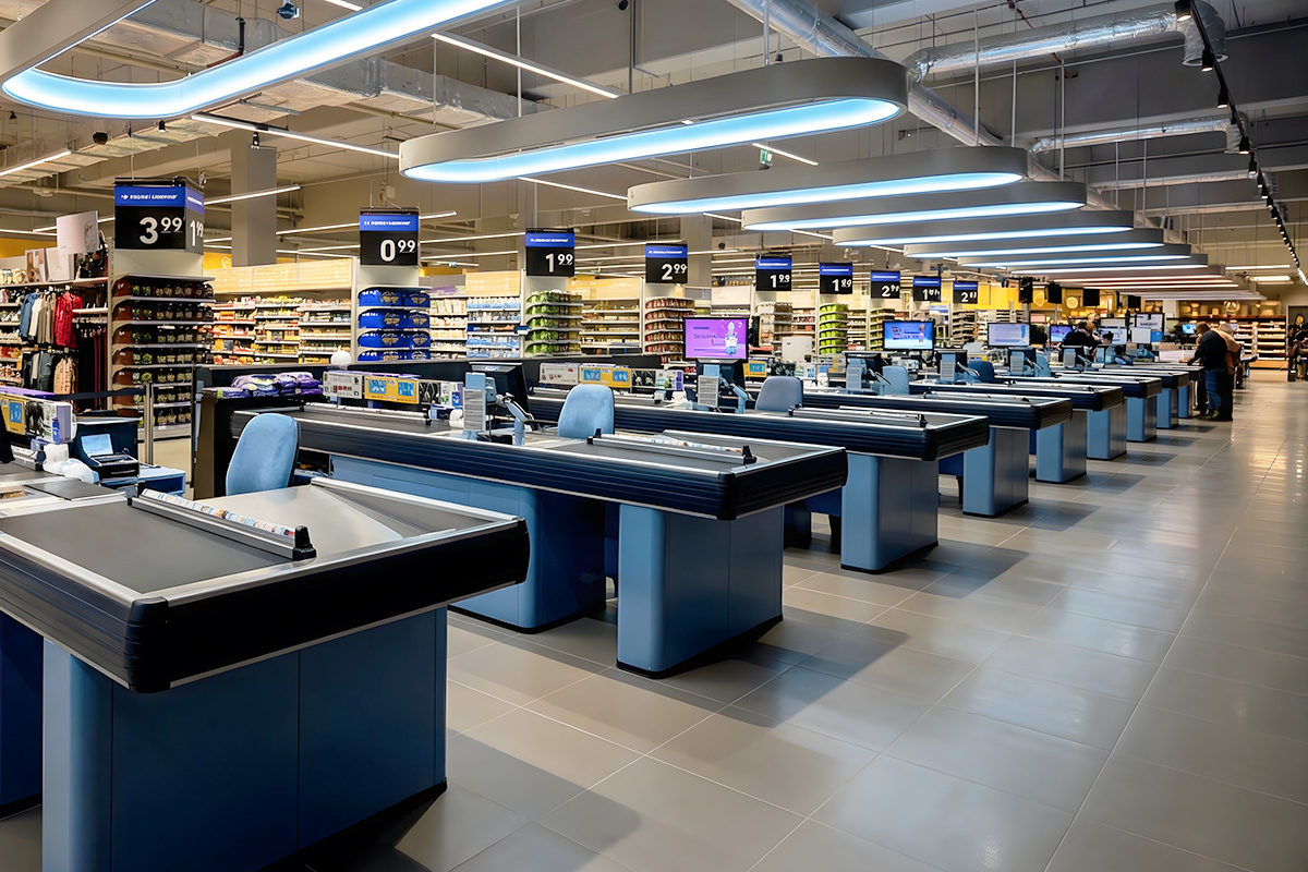 Situation: Retail floor space exceeds 800 m², large purchases frequently contain 30–80 items, and customer flow is intense throughout the day. Queues can be lengthy at weekends.