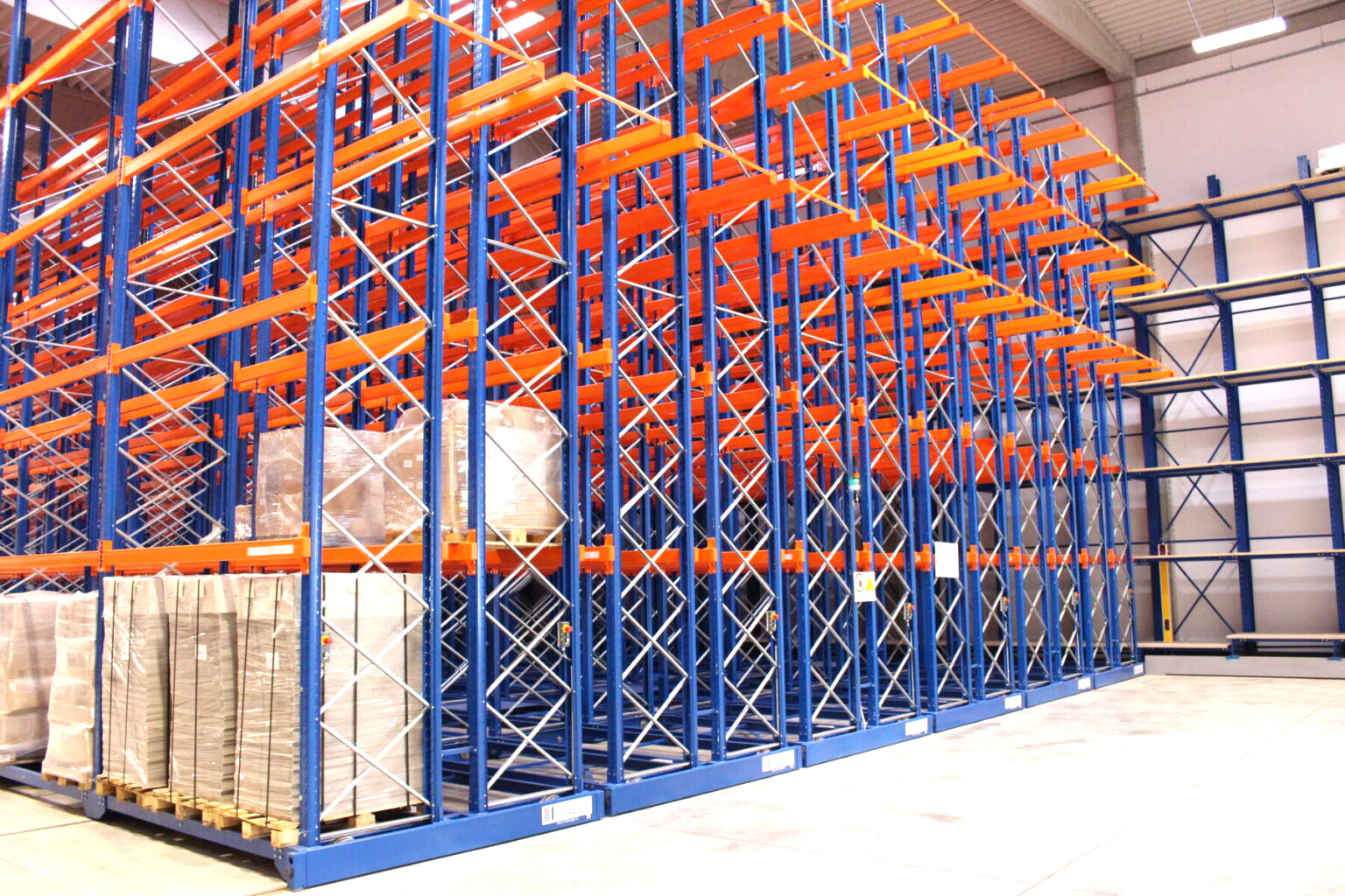 Крупные логистические центры и дистрибуционные склады со средней ротацией SKU и регулярным оборотом поддонов выигрывают от высокой ёмкости при сохранении прямого доступа к любому поддону. Здесь мобильная система эффективнее стеллажей drive-in, поскольку не требует организации товарного потока по принципу LIFO/FIFO — к любому поддону можно получить доступ в любой момент.